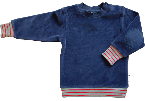 Varene på denne siden er av myk velur. Krage, mansjetter og linning er dobbelt lag av interlock-strikket stoff (finribbet). På albuer og knær er det påsydd ekstra beskyttelse av stoff med punkter. Genserne i str. 86/92 og 98/104 har trykknapper på venstre skulder. Buksene har knyting i et finribbet felt øverst slik du ser på bildet. Kantene nederst på buksene kan brettes opp.
